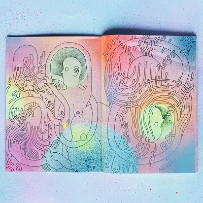 I tend to draw the people around me at home / in restaurants / on public transport, as well as scenes from my dreams and ideas for bigger drawings, animations, and screen prints / Lino cuts. I also do a lot of thumbnailing for illustration jobs in my sketchbooks. They are basically the first port of call for all the image making I do. A lot of my more finished work suffers from being overwrought and over thought. The sketchbook stuff has a messy immediacy which is useful for me to remain engaged with.