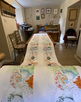 I begin every day by stumbling to my studio with a cup of tea. The next couple of hours before breakfast are usually my most productive, and I make sure to have ready in there whatever job I want to make the most progress with in the day. I work all day if I can, then normally spend the evenings drawing in my sketchbook, indoors upon the sofa.