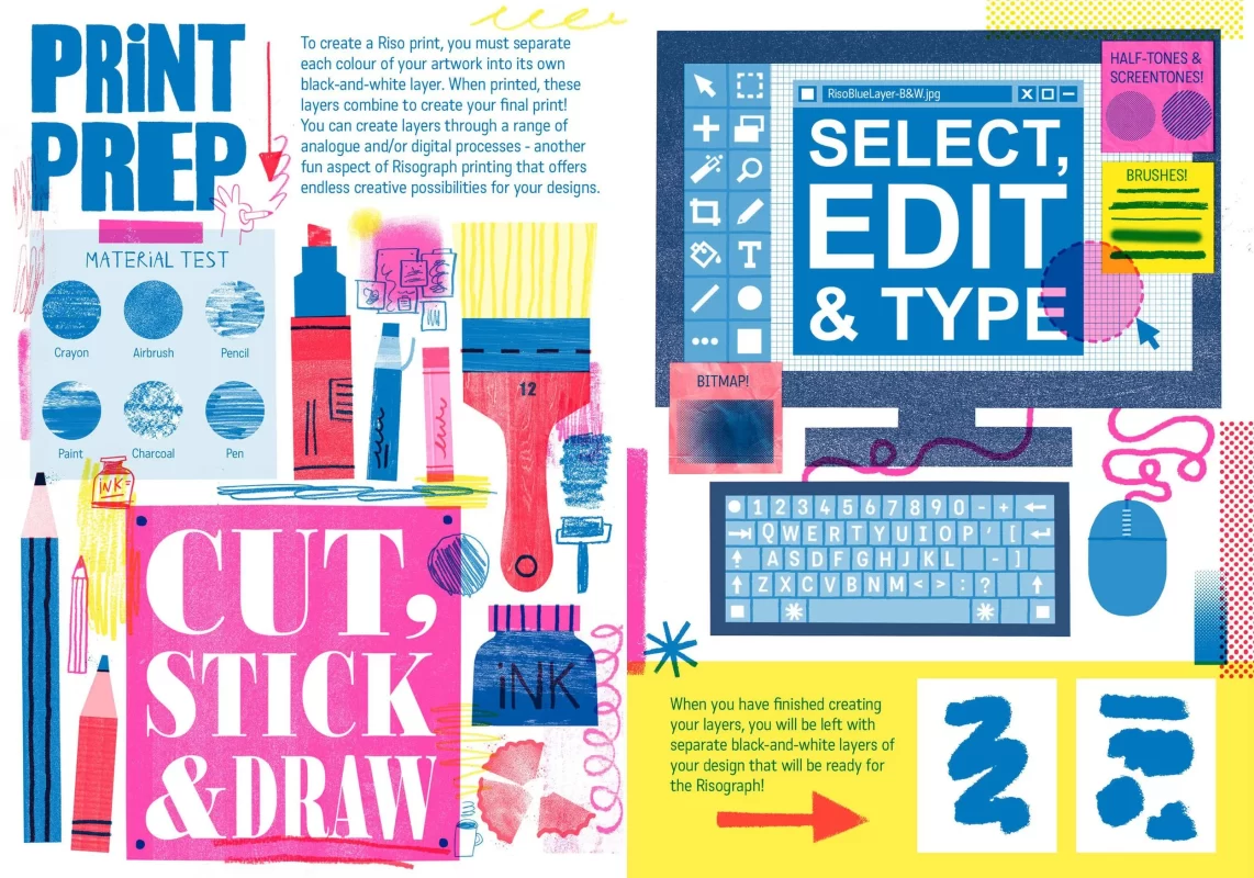 Hello Riso is a unique introduction to the history and craft of Riso printing. It’s written and illustrated by Beth Izatt, an Illustration tutor at Hereford College of Art who specialises in experimental printmaking. It’s a twenty four page A5 book, 142mm by 198mm, printed on 170gsm Munken paper, and printed in four colour riso. It’s packed with tips and information on riso printing, as well as a beautiful object in itself.